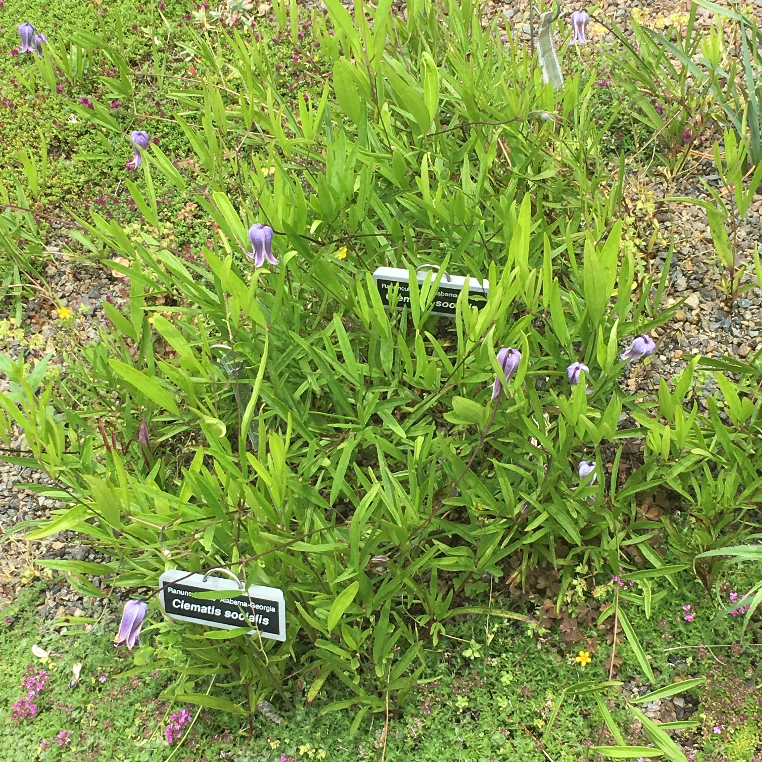 Clematis socialis is a colony forming herbaceous perennial clematis, non-climbing. In the wilds of Alabama and Georgia it lives in meadows with native grasses and other wildflowers. We grow it in full sun with a groundcover of creeping thymes (several forms including wooly thyme and T. minimus), which seem to shade the roots but allow new shoots to pop up easily. Summer blooming, and will repeat with deadheading. Tolerates heat with sufficient water.