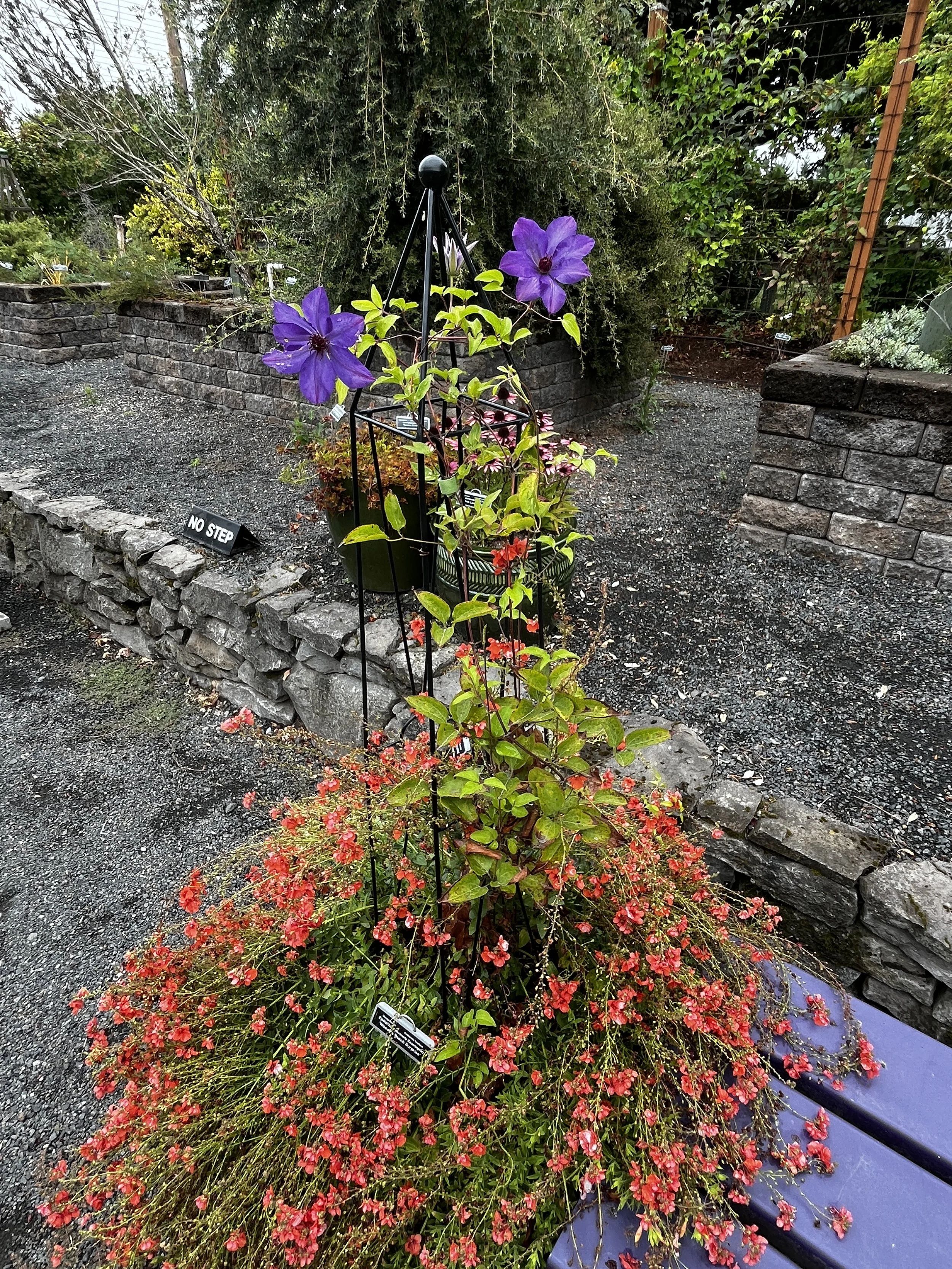 This new feature of the Rogerson Clematis Garden is a long perennial border opposite the Coop Border. It begins with an anonymously donated metal arc with waving stems of reeds on which large-flowered hybrids climb, greeting visitors with that which they expect to see. But beyond the arc are the other forms of clematis most people don’t know about. Large flat panel trellises are populated by clematis that get big. They are fronted by clematis that cannot climb, in all of their wonderful colors and flower forms. A series of urns house draping clematis from the Atragene section (this is the section with C. macropetala and C. alpina, among many other species), which start flowering in April and repeat bloom through the summer. We have some woody shrub clematis here, too! Into all of this celebration of the variation within the genus Clematis, we have added an array of herbaceous perennials from groundcovers to tall summer-blooming plants, including lilies and repeated stands of Celtica gigantea (syn. Stipa gigantea, stipa grass). We have carefully selected a few shrubs into which the non-climbing clematis may loll if they choose.