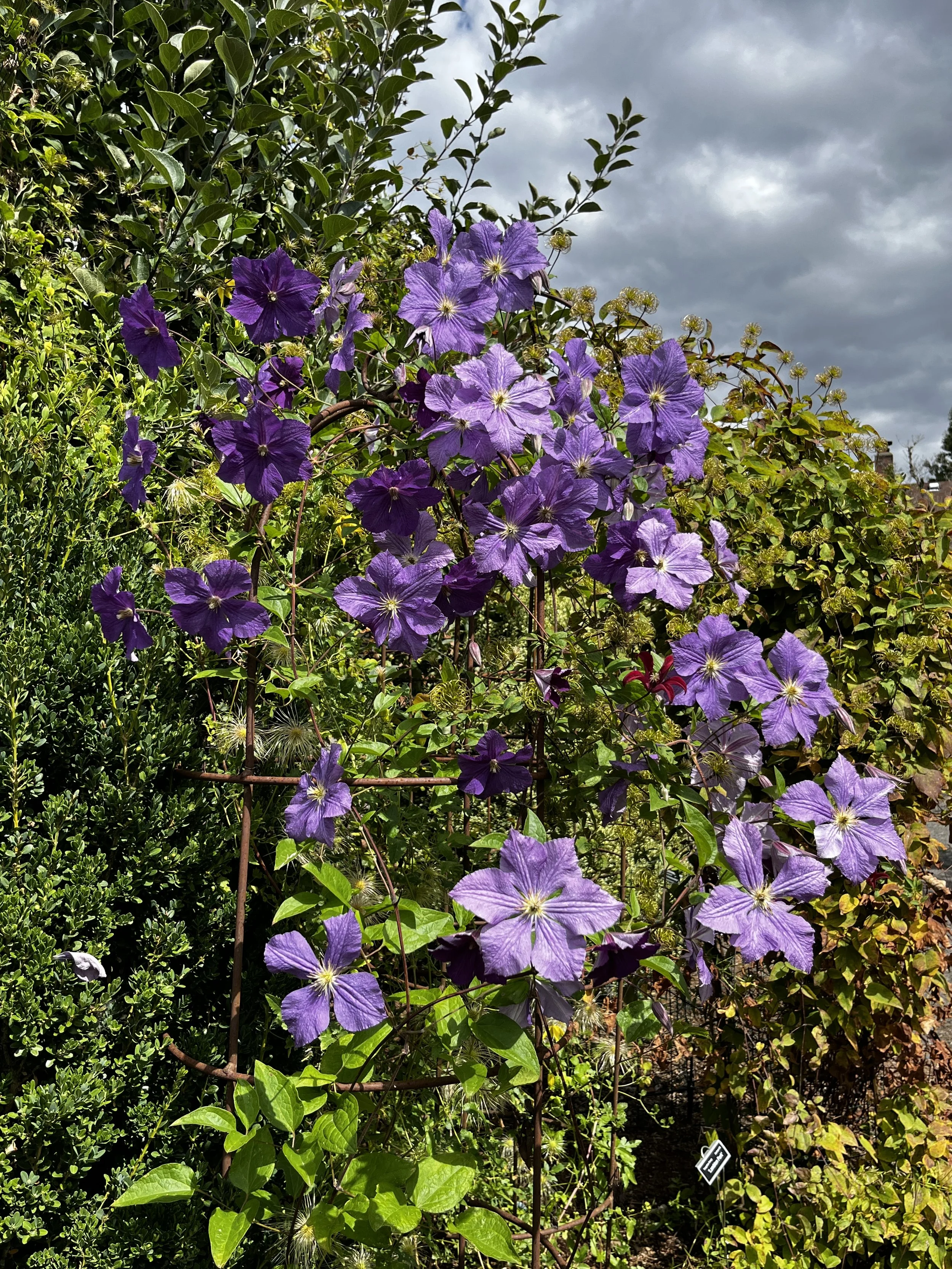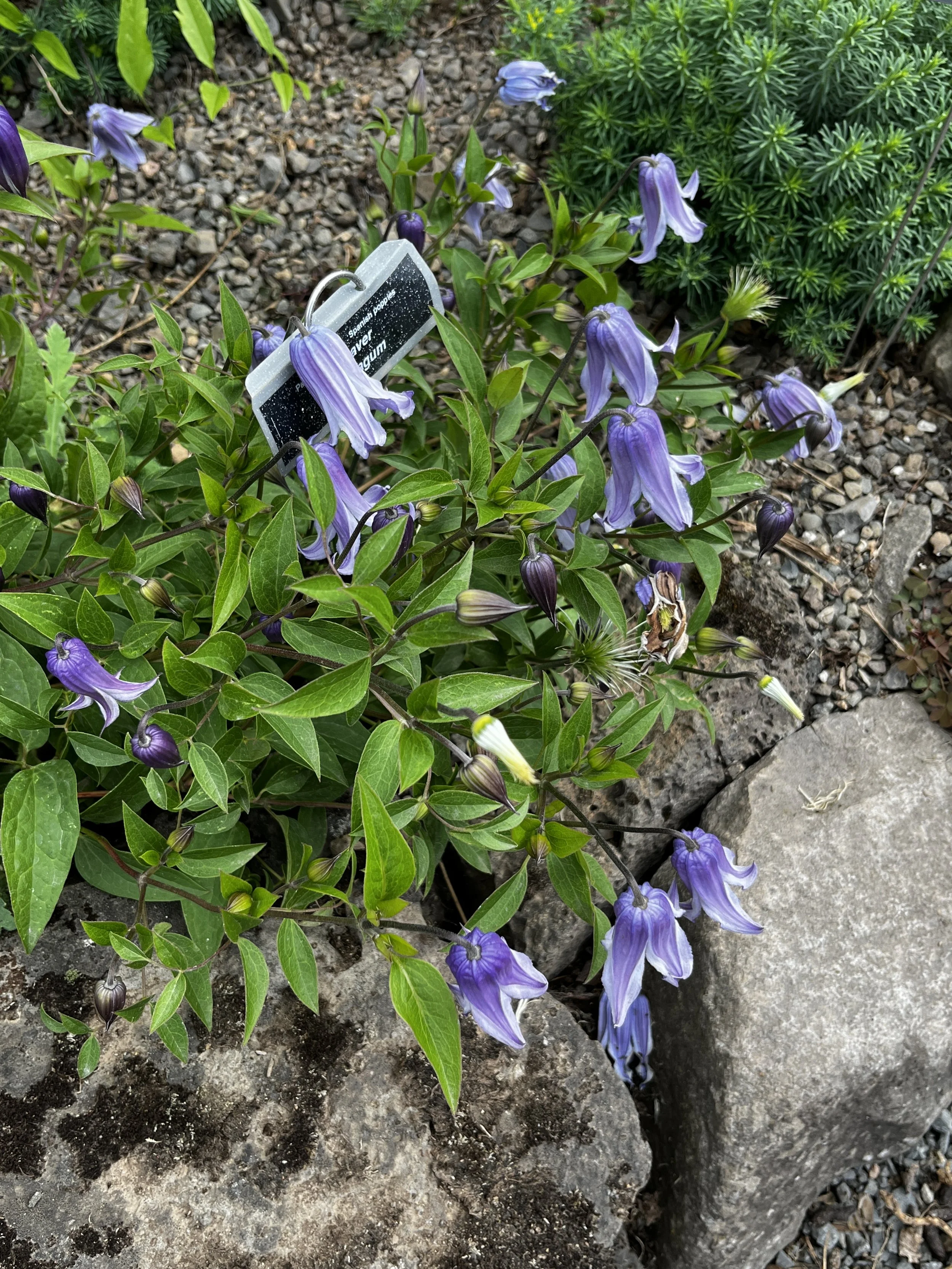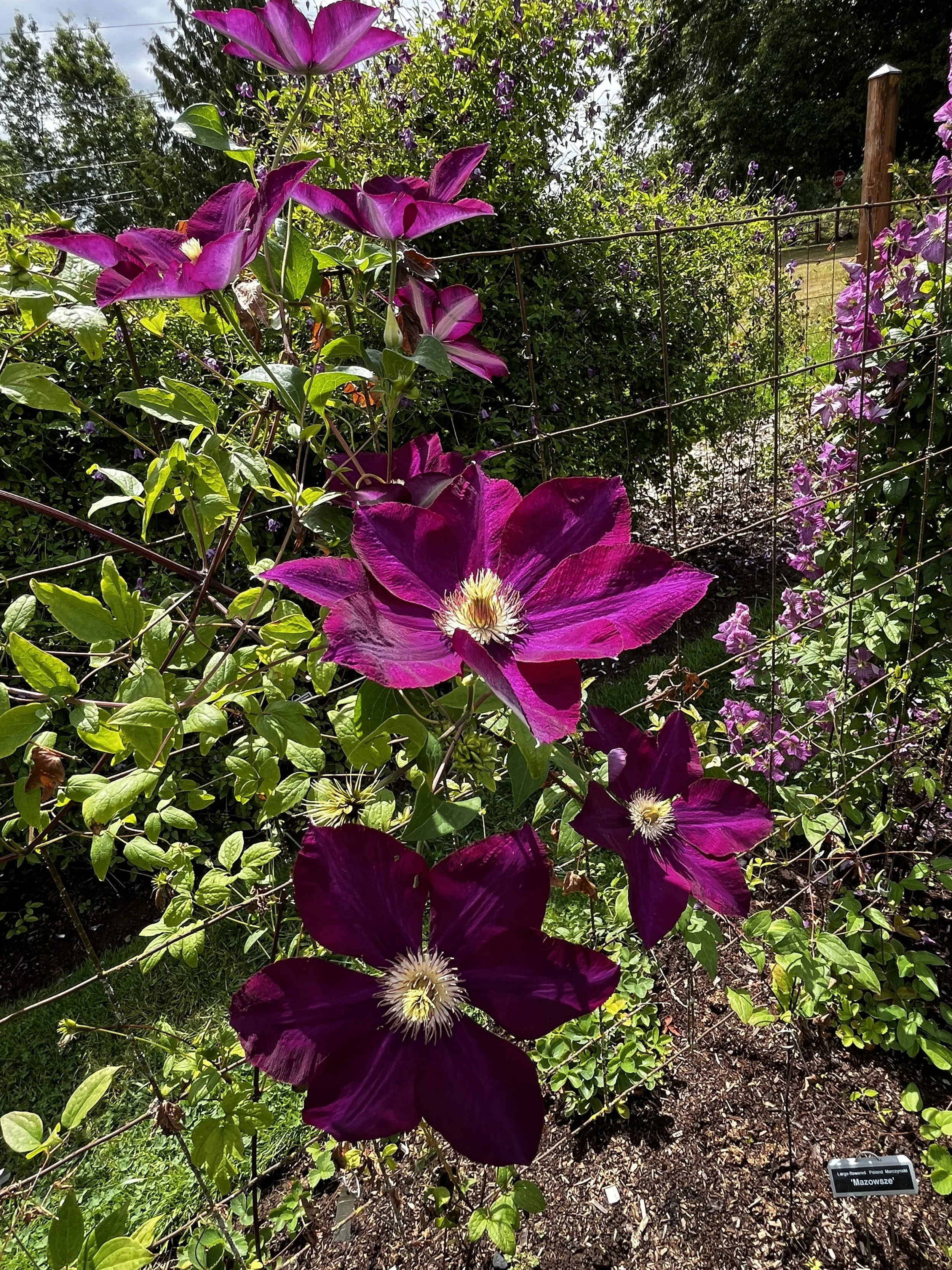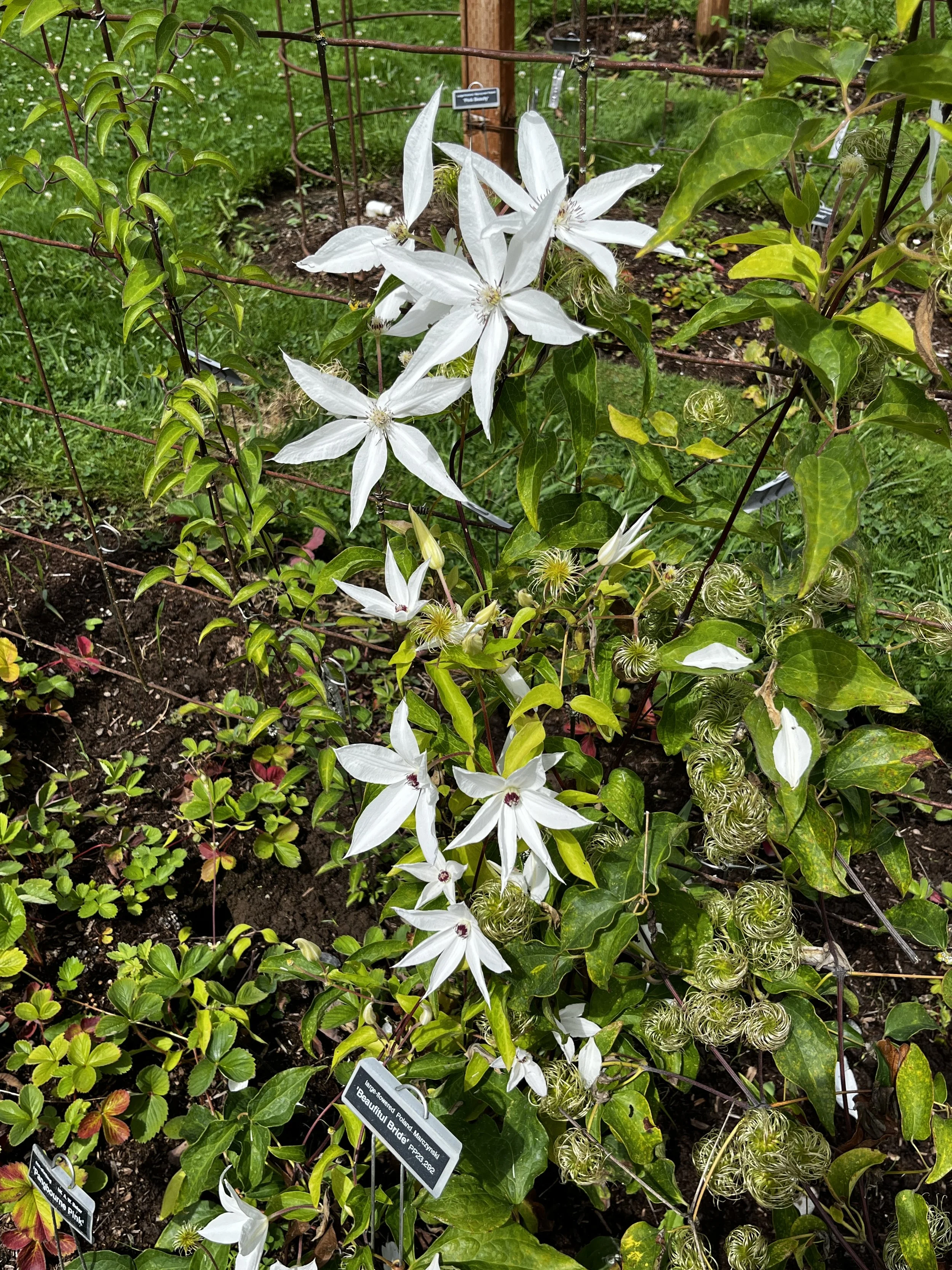 C. heracleifolia, ‘Blue Belle’, ‘Madame Julia Correvon’ (best seen from bed 14), ‘Elsa Spath’, ‘Etoile Rose’ (best seen in the crabapple from Bed 14), C. urticifolia, C. viticella, C. reticulata best seen in Bed 13