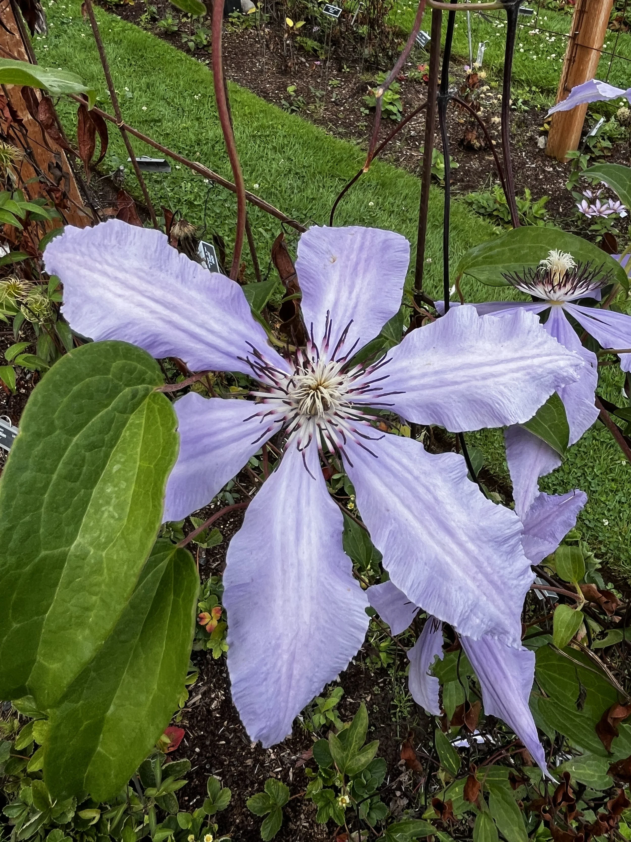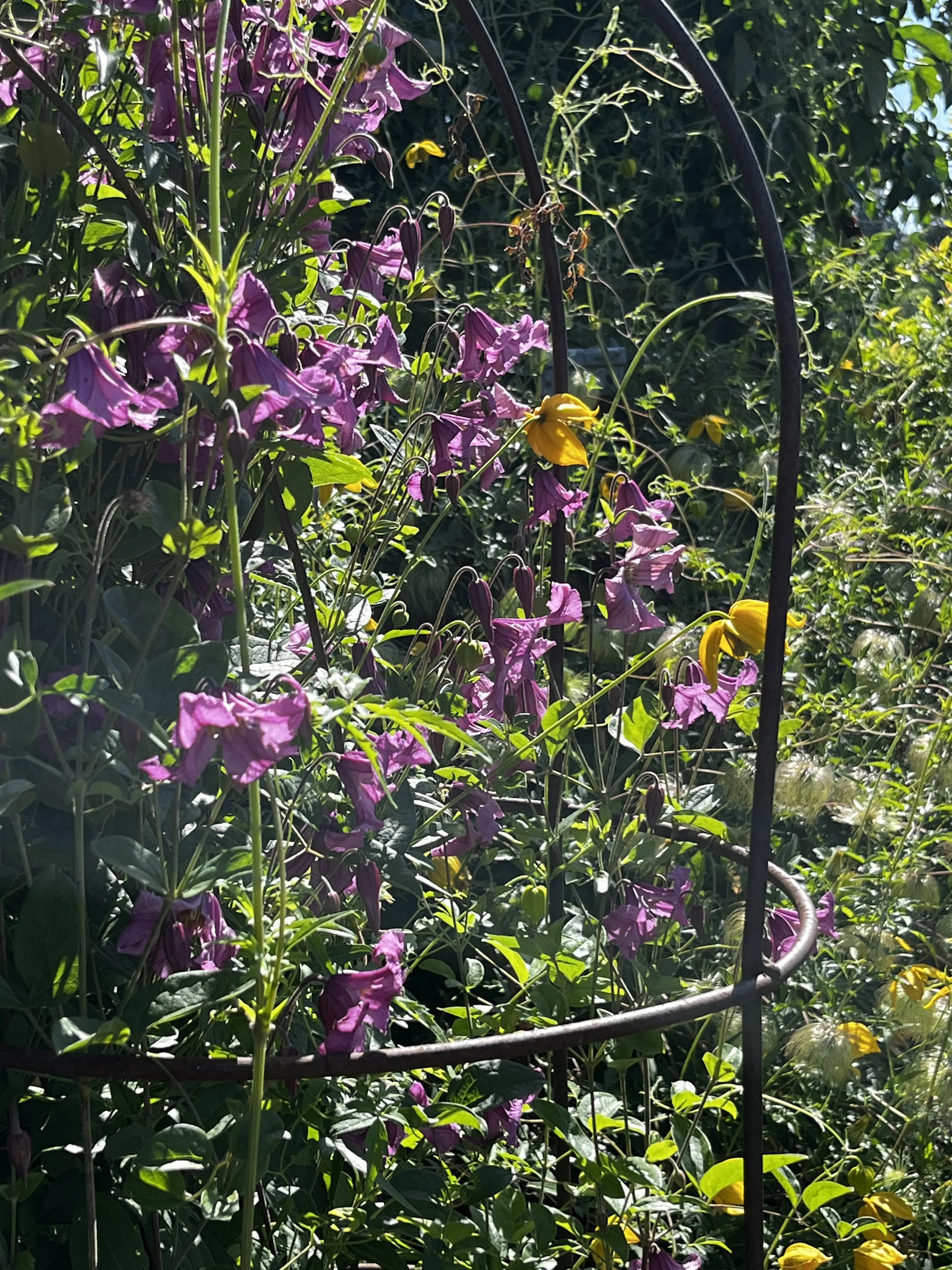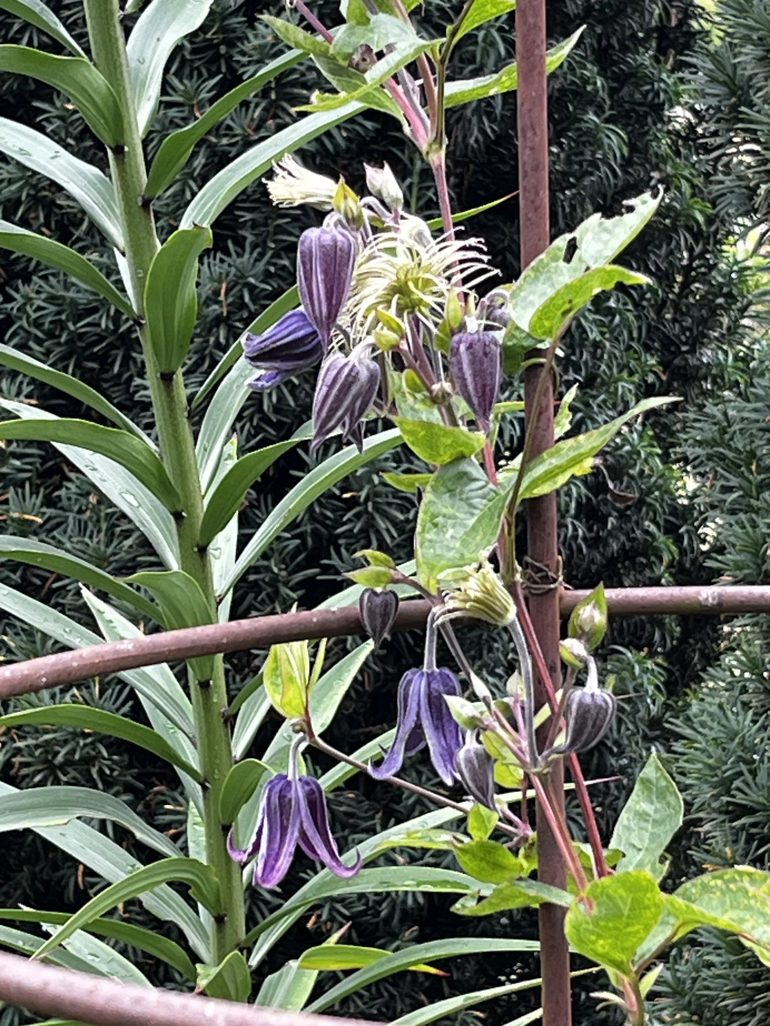 C. heracleifolia, ‘Blue Belle’, ‘Madame Julia Correvon’ (best seen from bed 14), ‘Elsa Spath’, ‘Etoile Rose’ (best seen in the crabapple from Bed 14), C. urticifolia, C. viticella, C. reticulata best seen in Bed 13