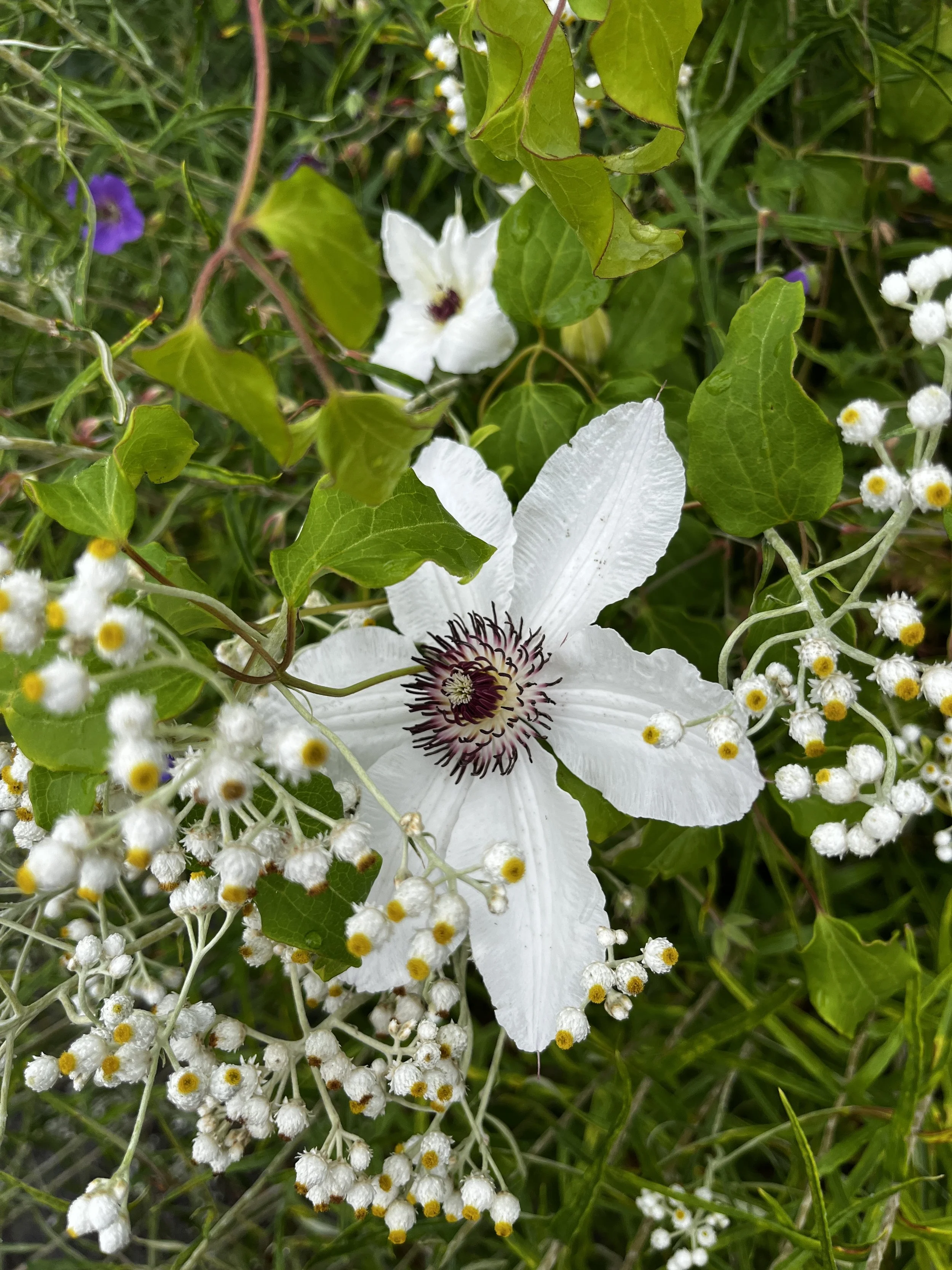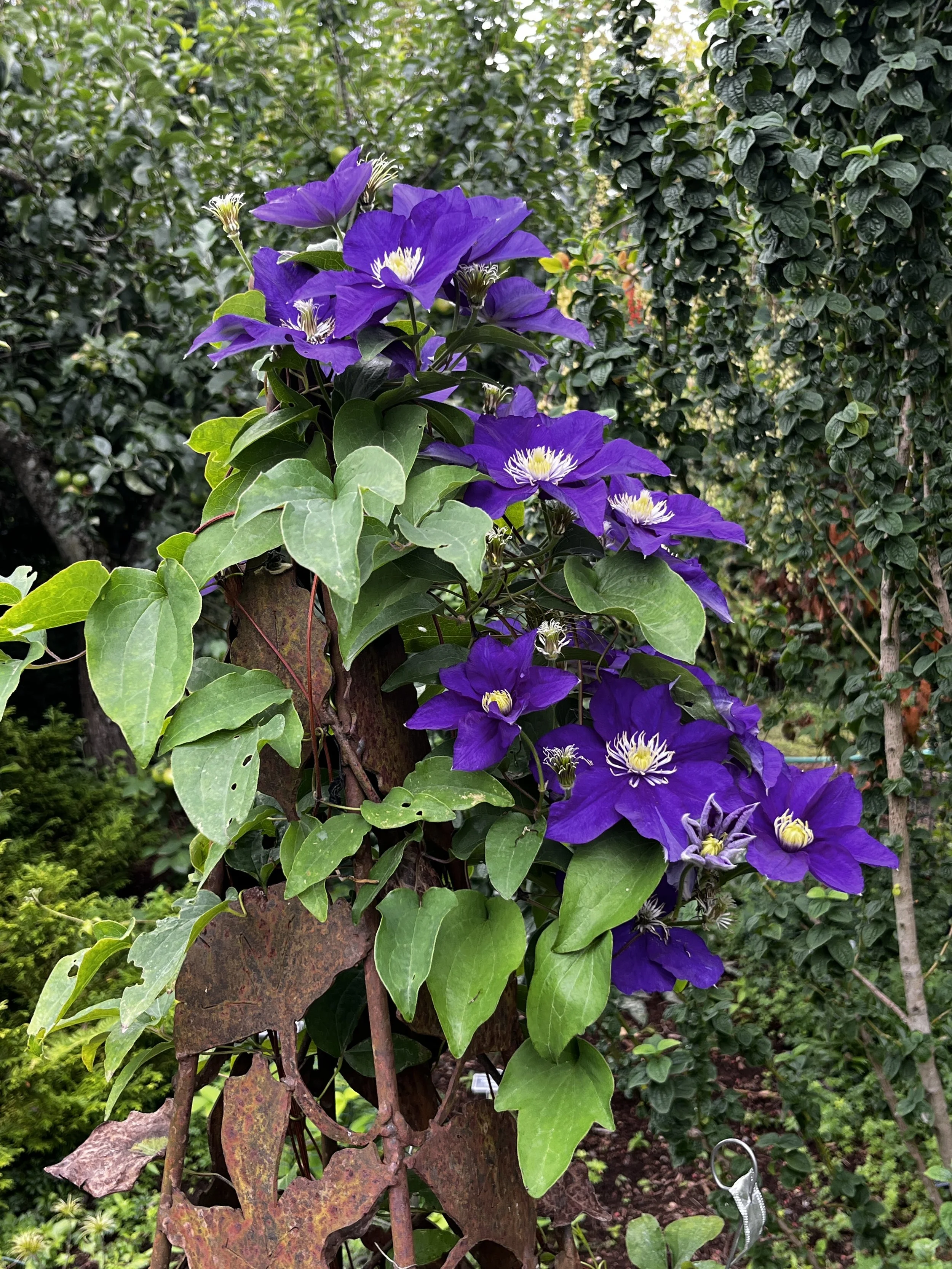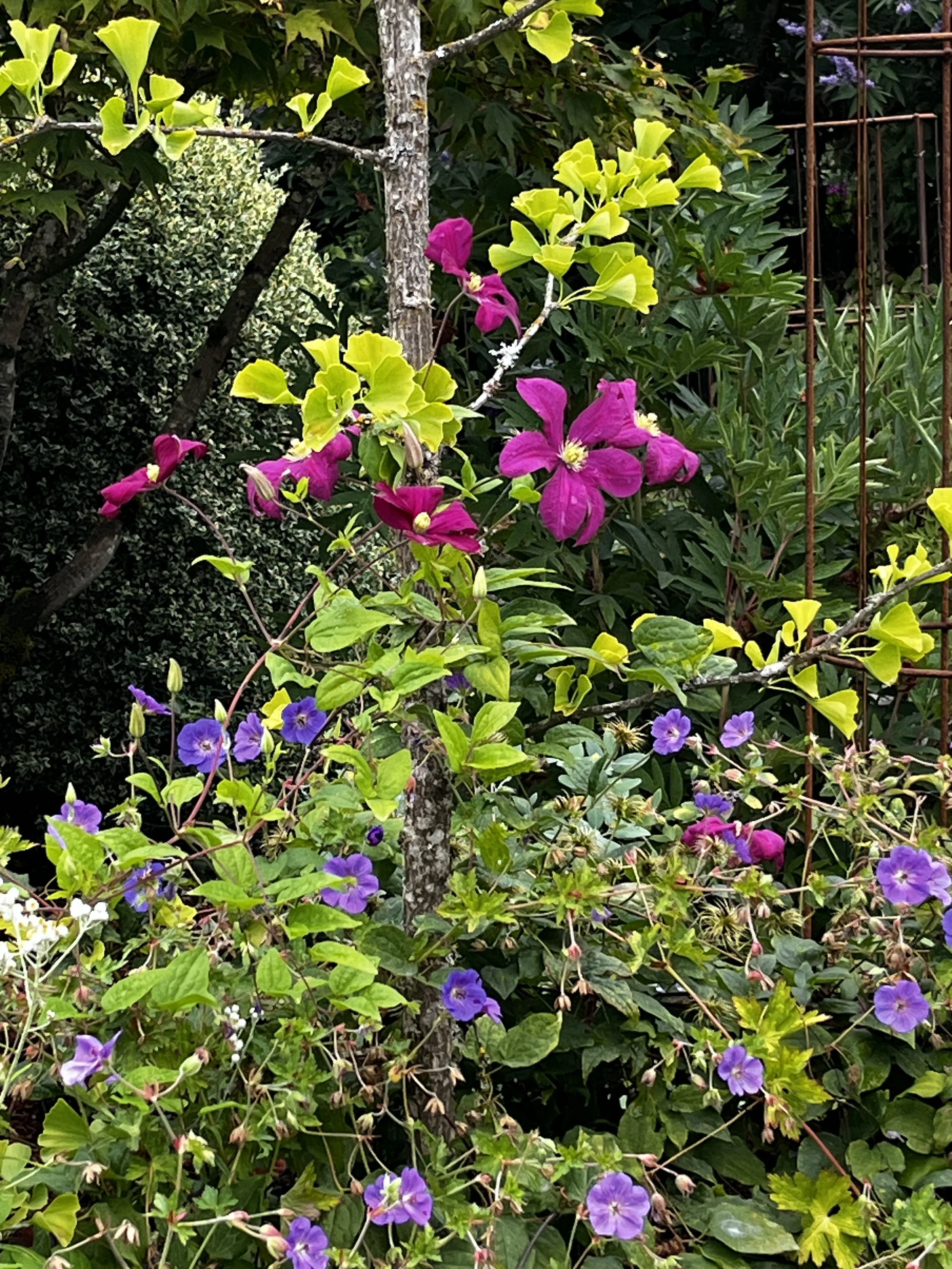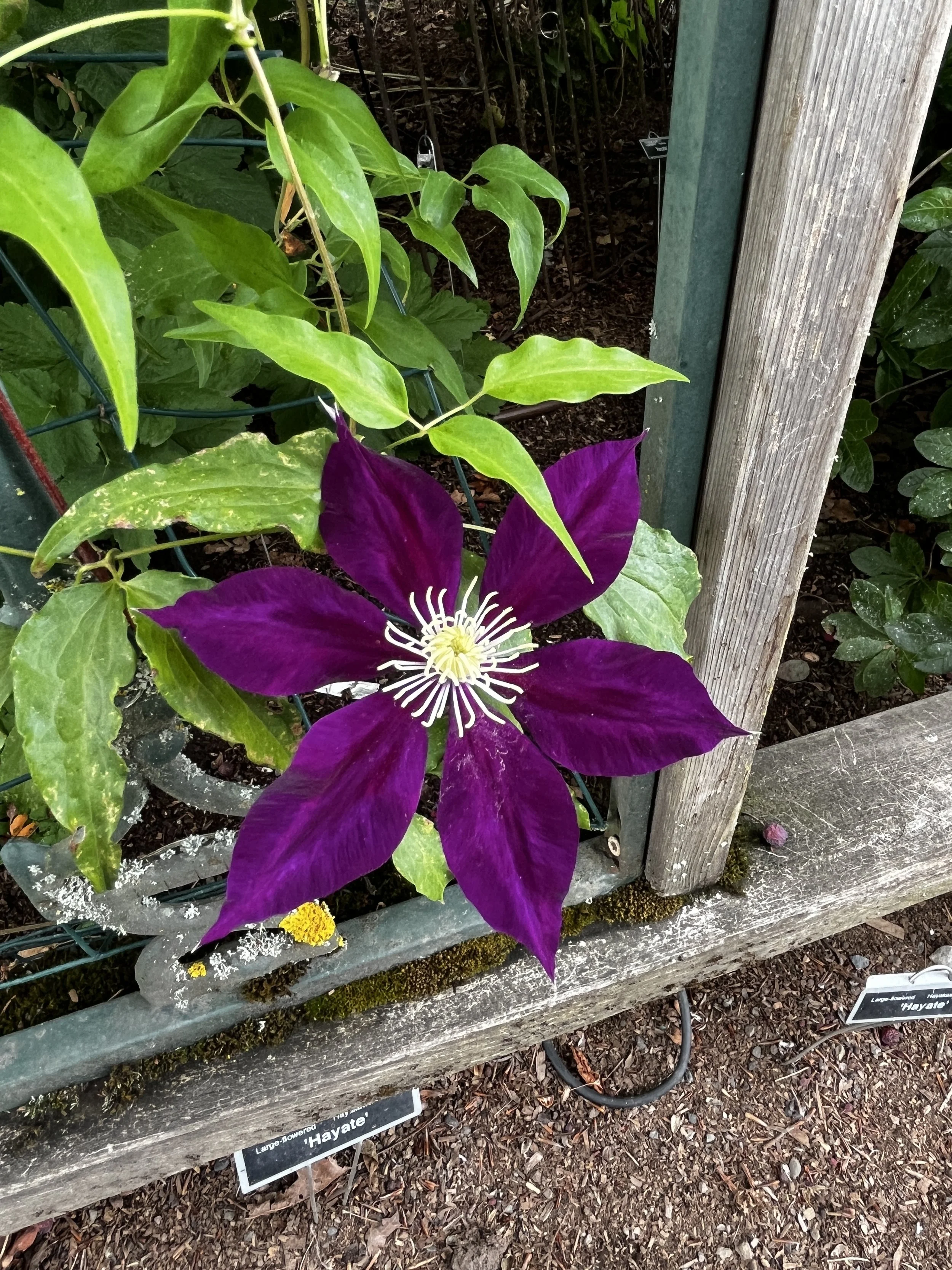 C. heracleifolia, ‘Blue Belle’, ‘Madame Julia Correvon’ (best seen from bed 14), ‘Elsa Spath’, ‘Etoile Rose’ (best seen in the crabapple from Bed 14), C. urticifolia, C. viticella, C. reticulata best seen in Bed 13
