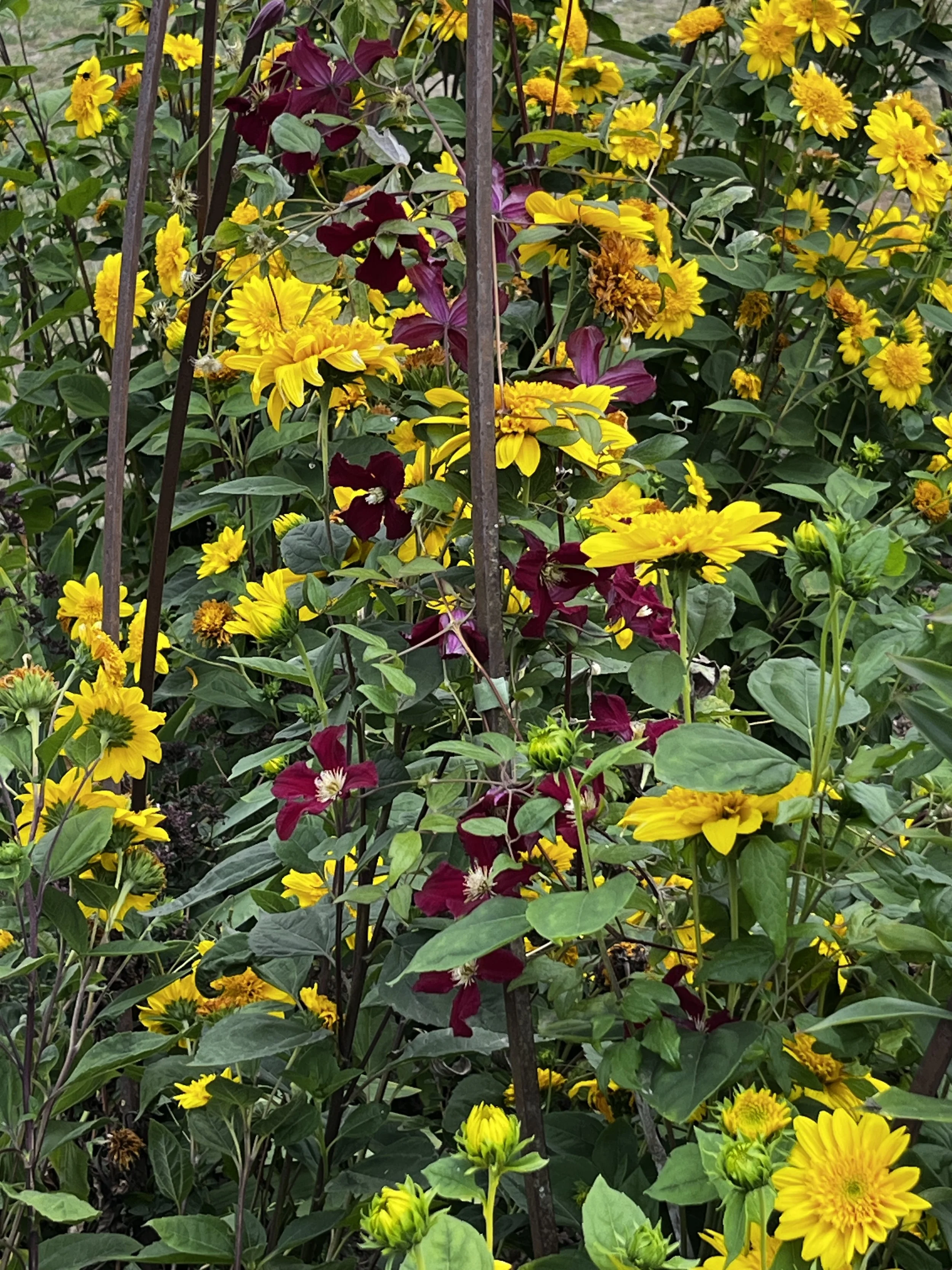 ‘Vitiwester’ (also sold as BURNING LOVE’ scrambling amid Helianthus flore-plena. This perennial sunflower is a naturally occurring double form that pollinating insects actually like. American Goldfinches feast on its seeds to prepare for their autumn migration.