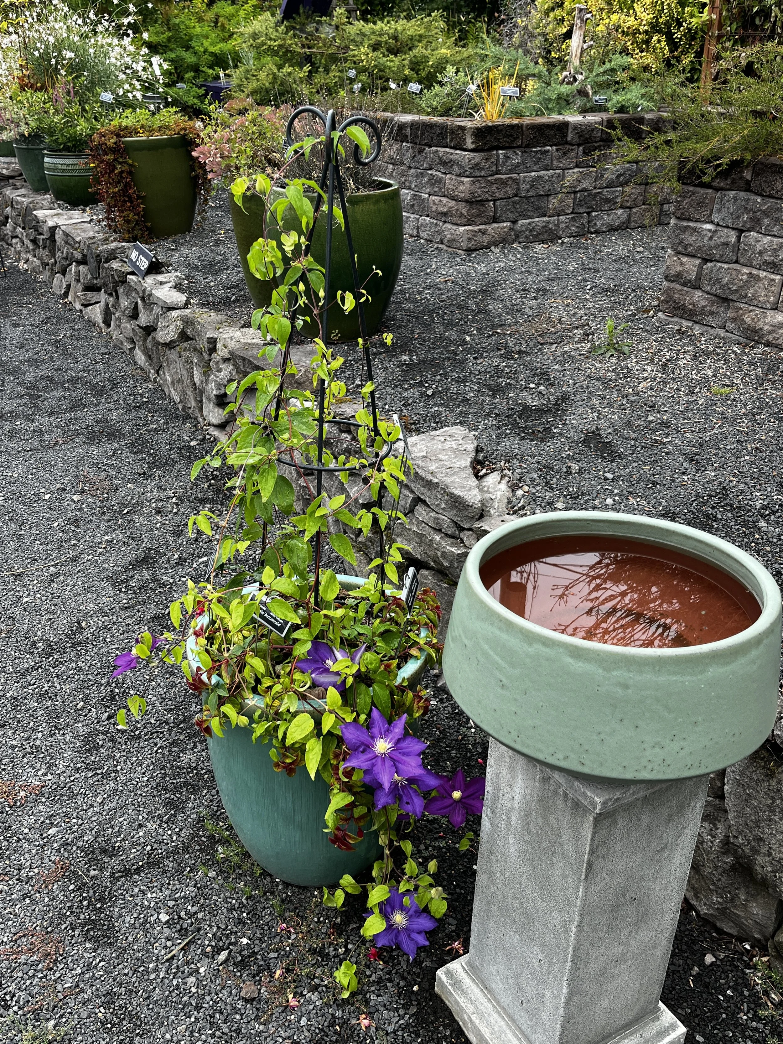 This area, between the Bob and Carol Gutmann Greenhouse and The Antipodes will be increasingly populated by a display/demonstration area for growing clematis in containers. We imagine a continually changing, slowly evolving space where those with small gardens will find suggestions and inspiration. Seating is coming soon, too! The broad pale green bowl in the container area will be used to make floating arrangements of clematis.