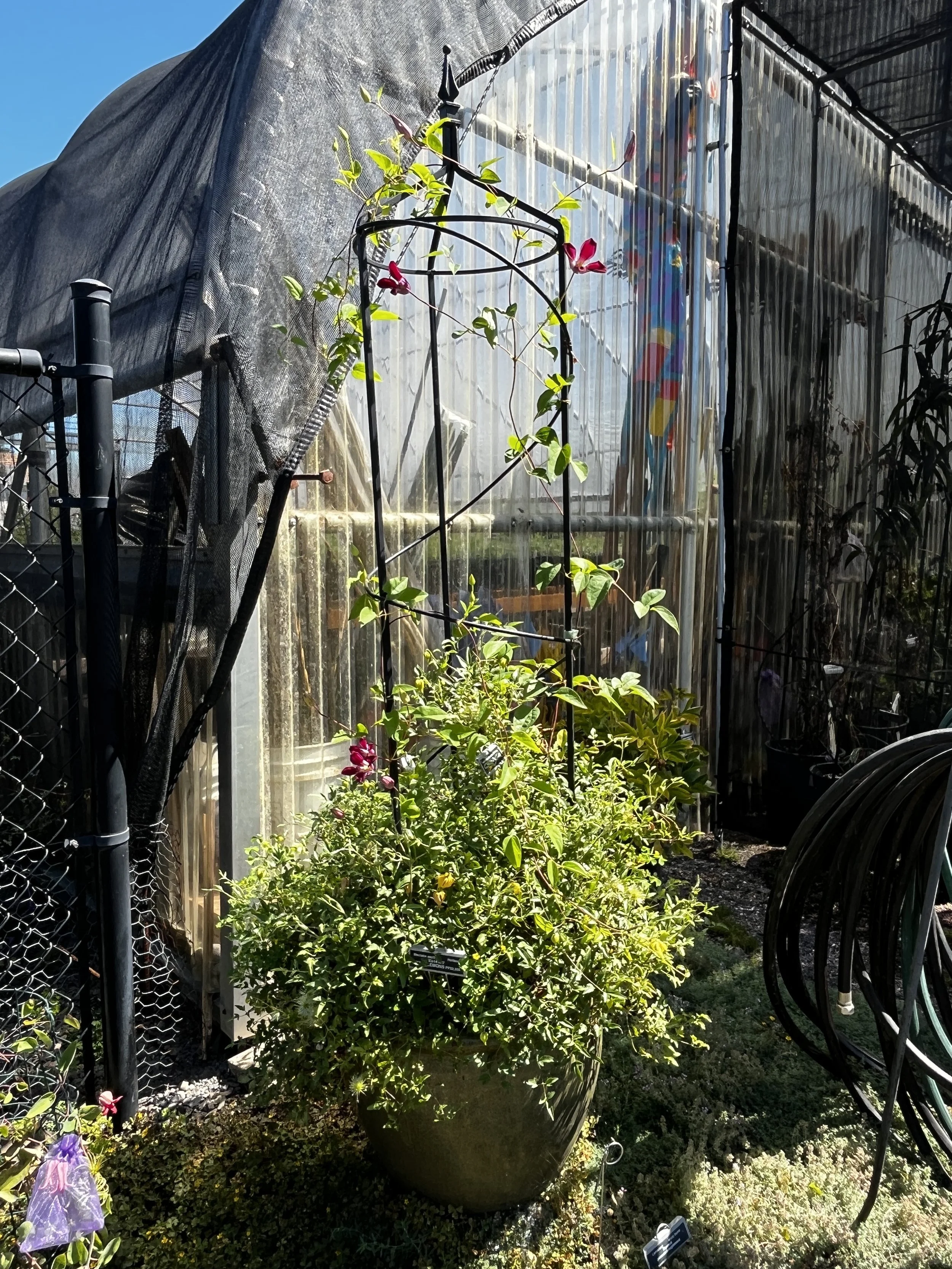 Inside the Sales Terrace, these clematis are growing on 4’ wide by 10’ tall flat panel trellises.