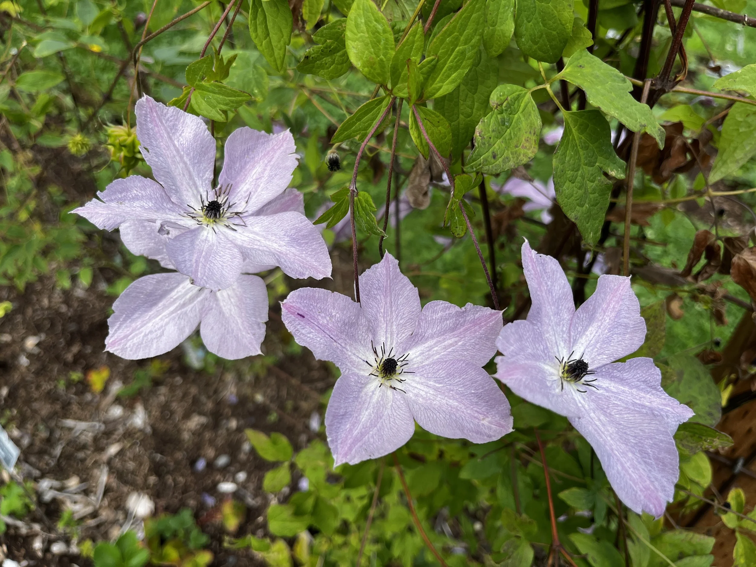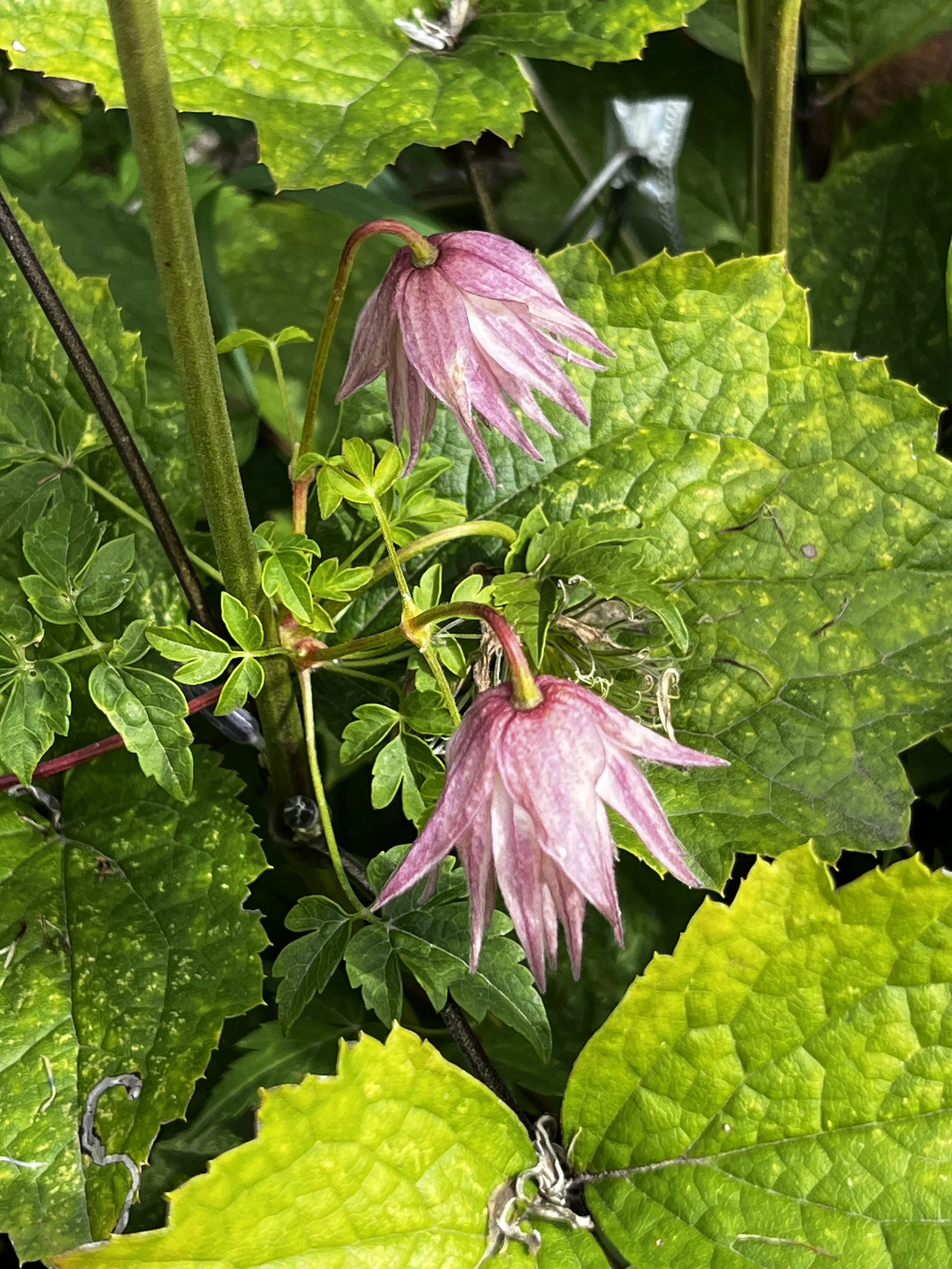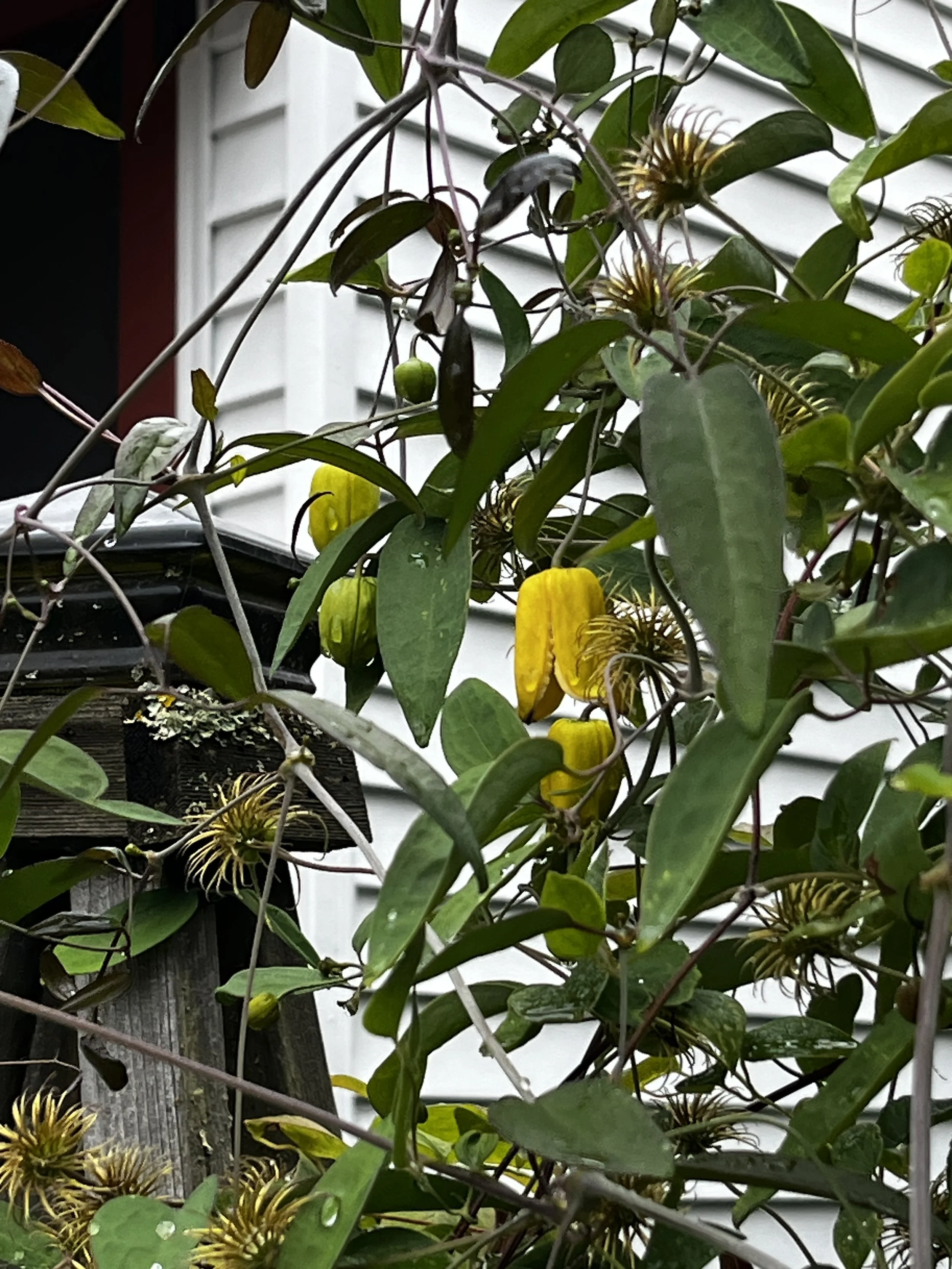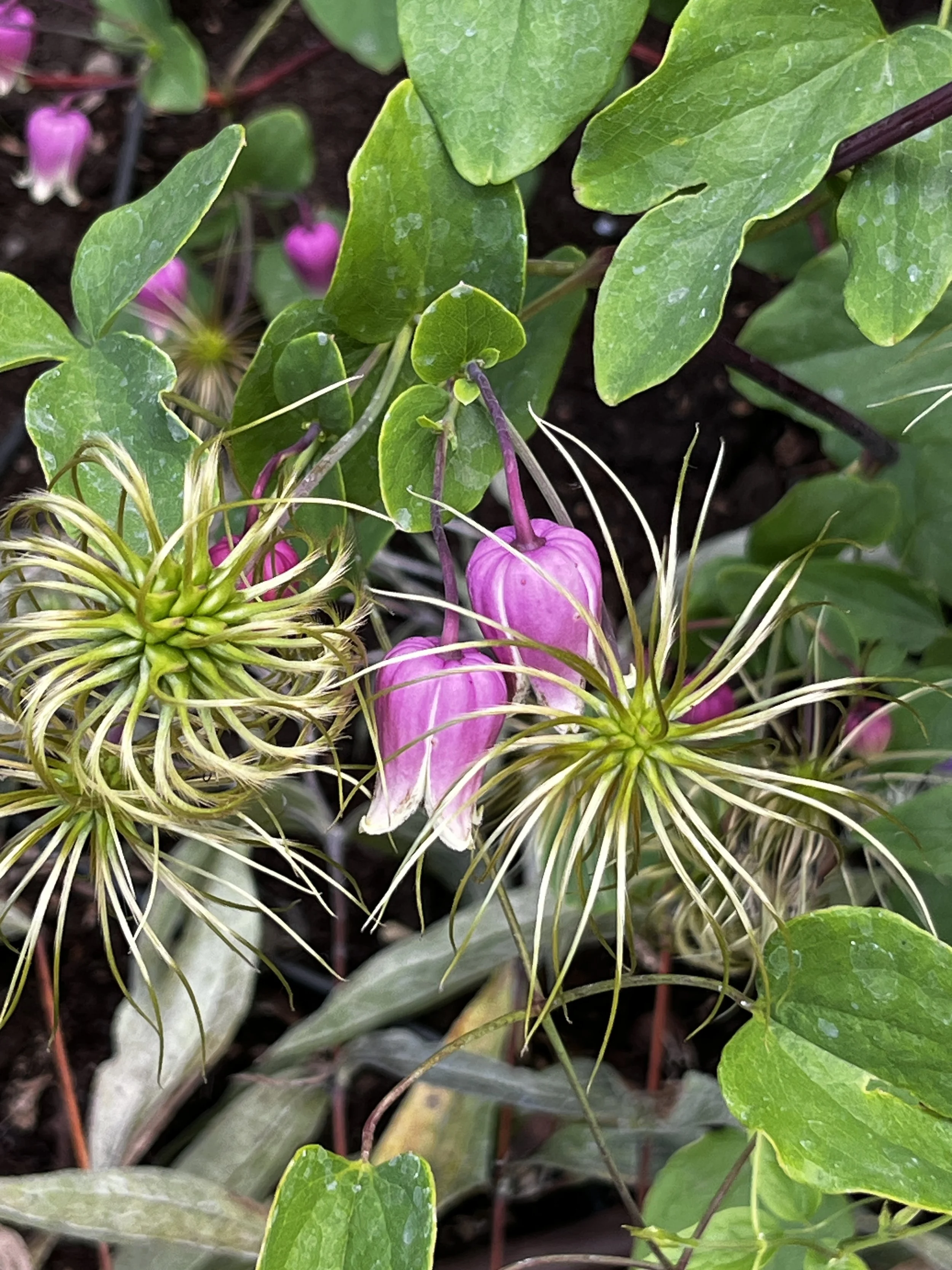 Clematis ‘Sharpie’ is one of many clematis in the Atragene section of the genus Clematis, proving we can have April blooms in August. Bed 16 container