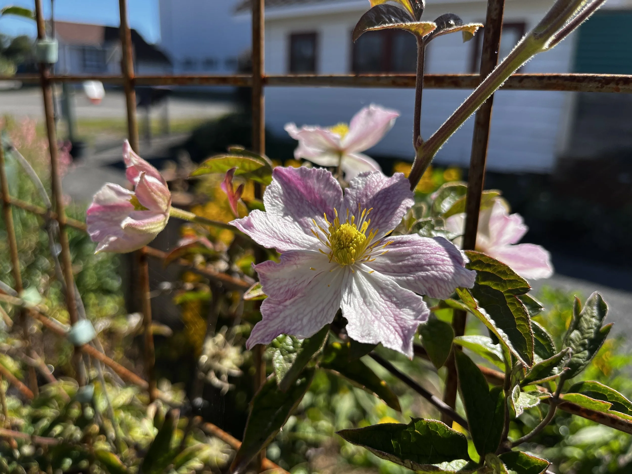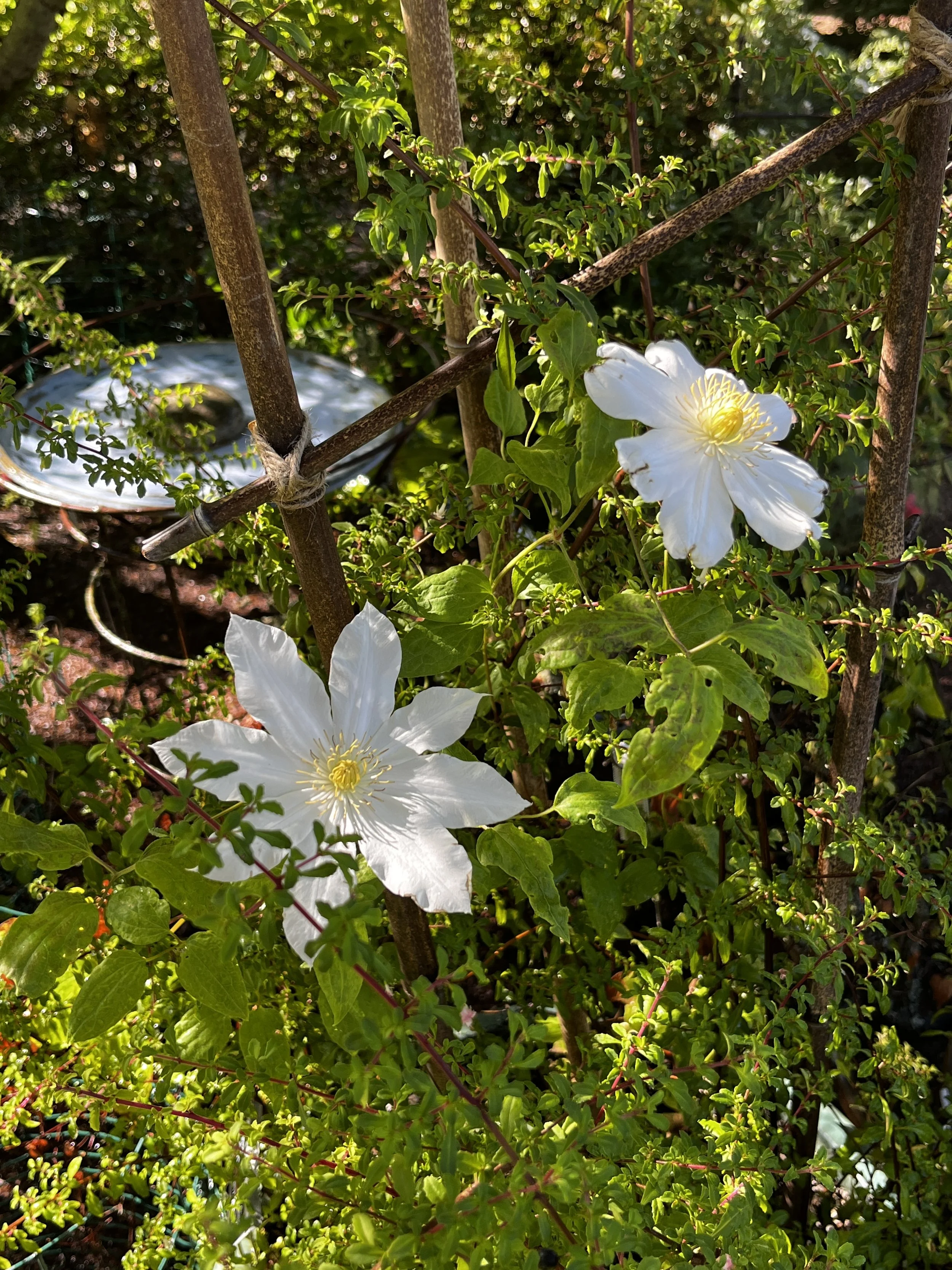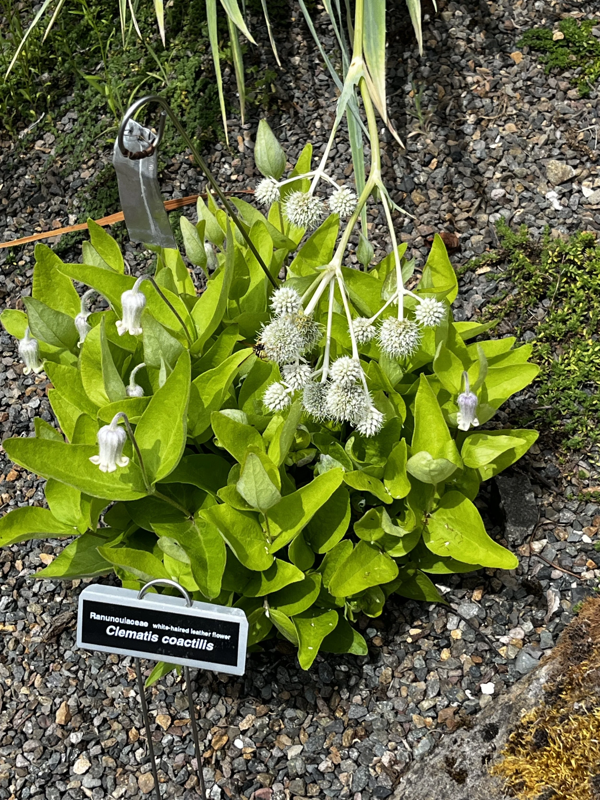 Clematis ‘Sharpie’ is one of many clematis in the Atragene section of the genus Clematis, proving we can have April blooms in August. Bed 16 container