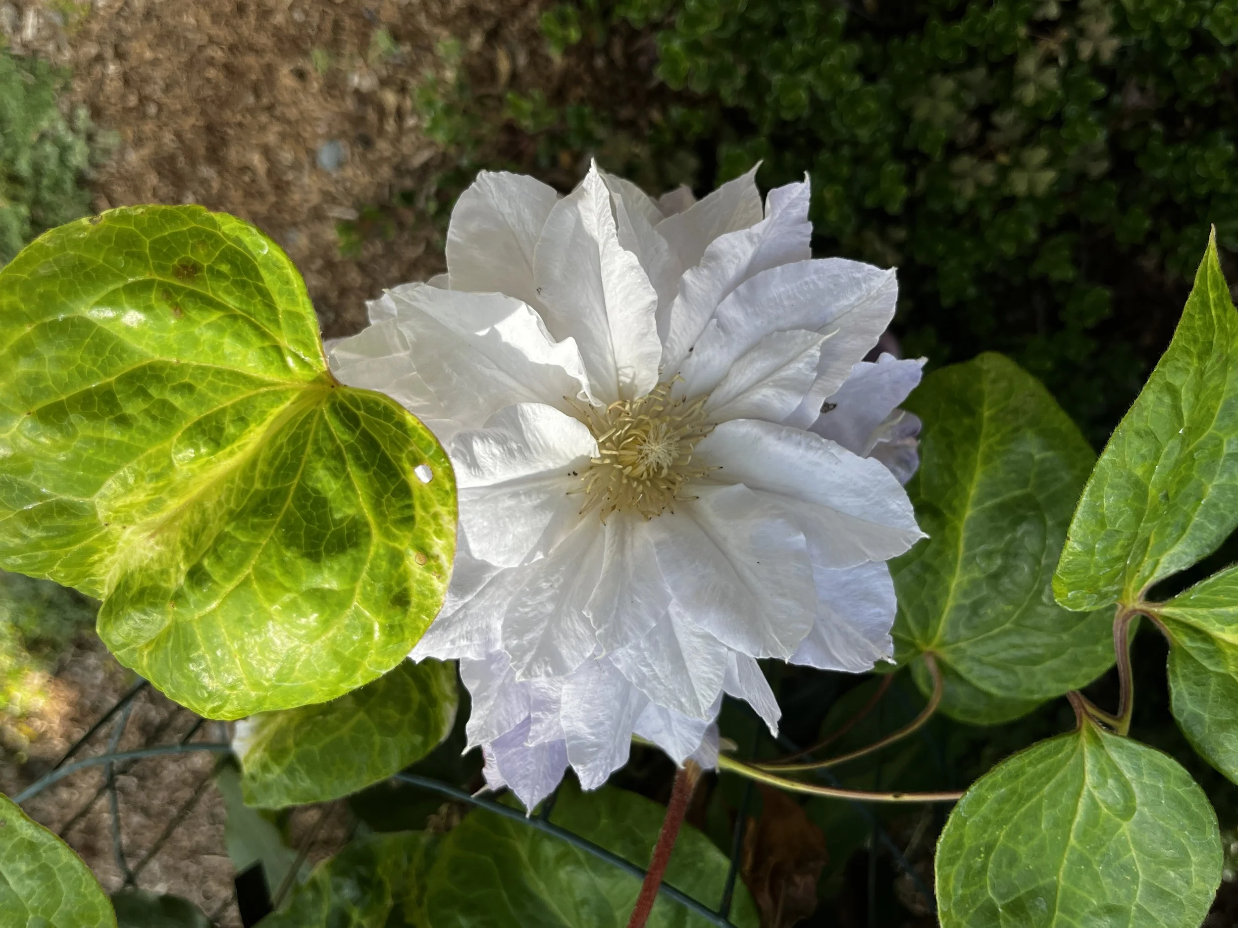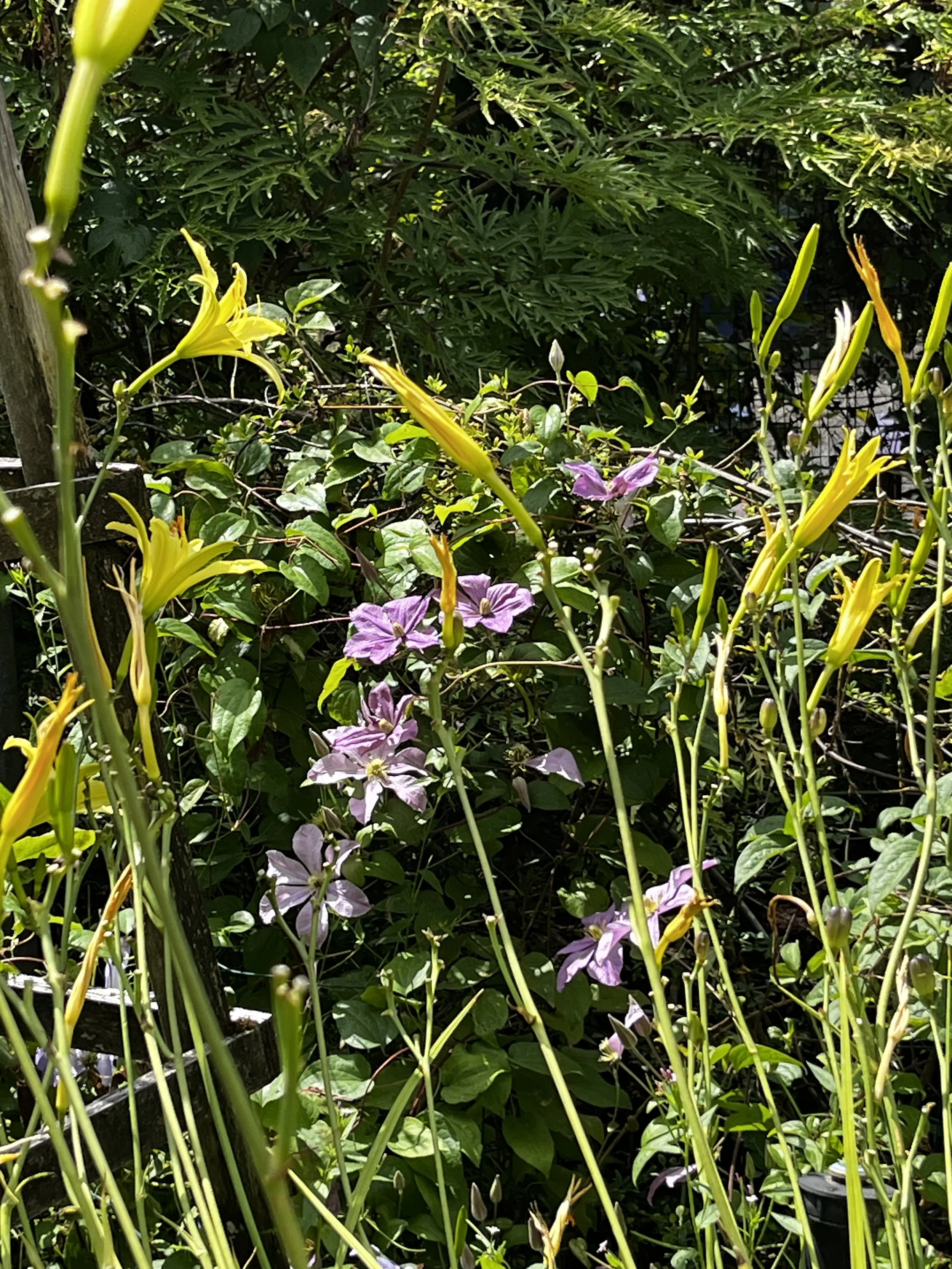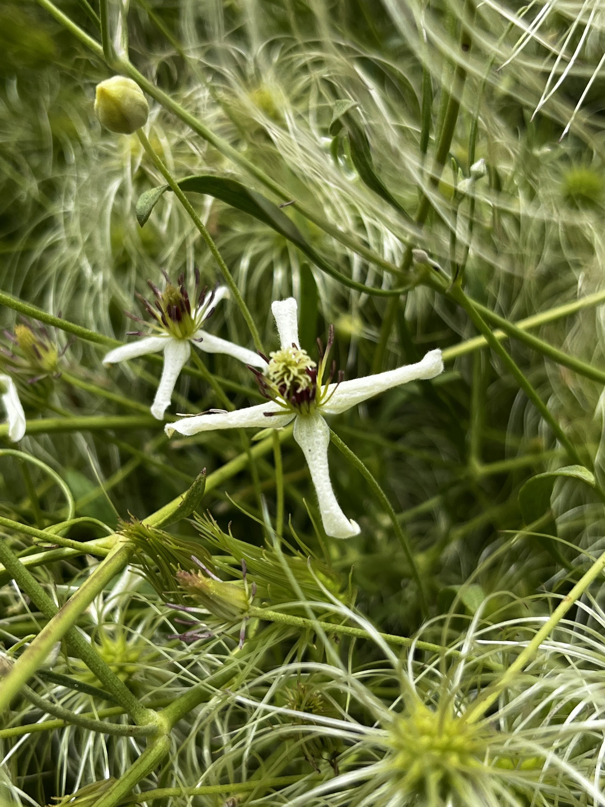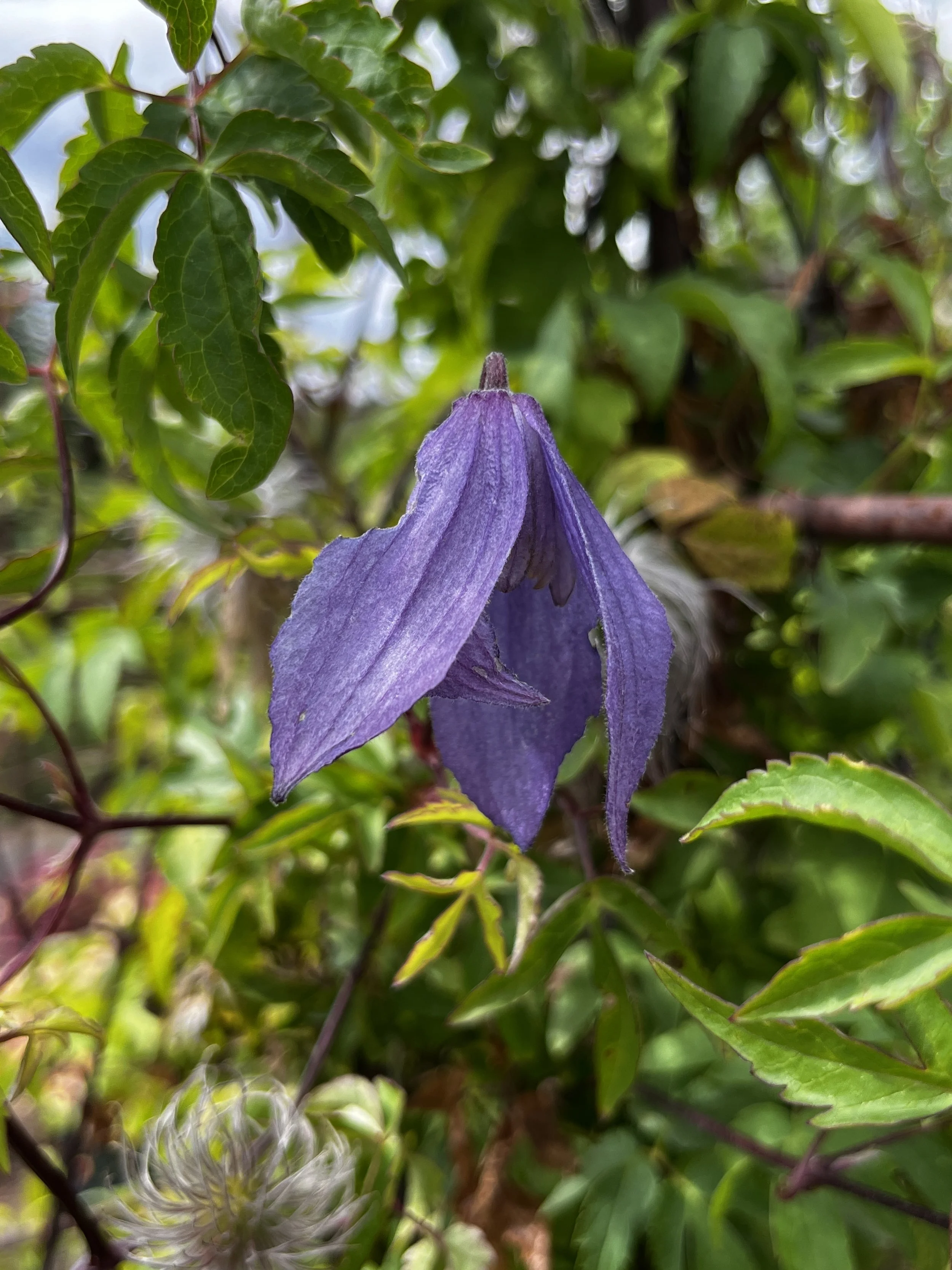 Clematis ‘Sharpie’ is one of many clematis in the Atragene section of the genus Clematis, proving we can have April blooms in August. Bed 16 container