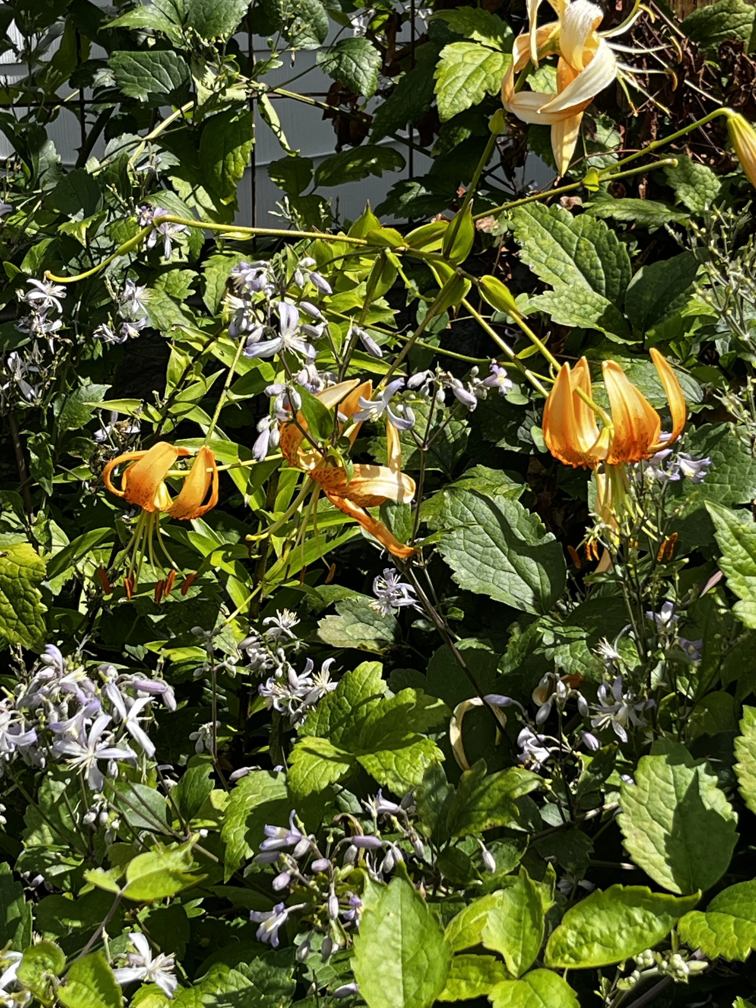 Clematis ‘Praecox’, a non-climber but big scrambler, helps support Lilium henryi in Bed 8.