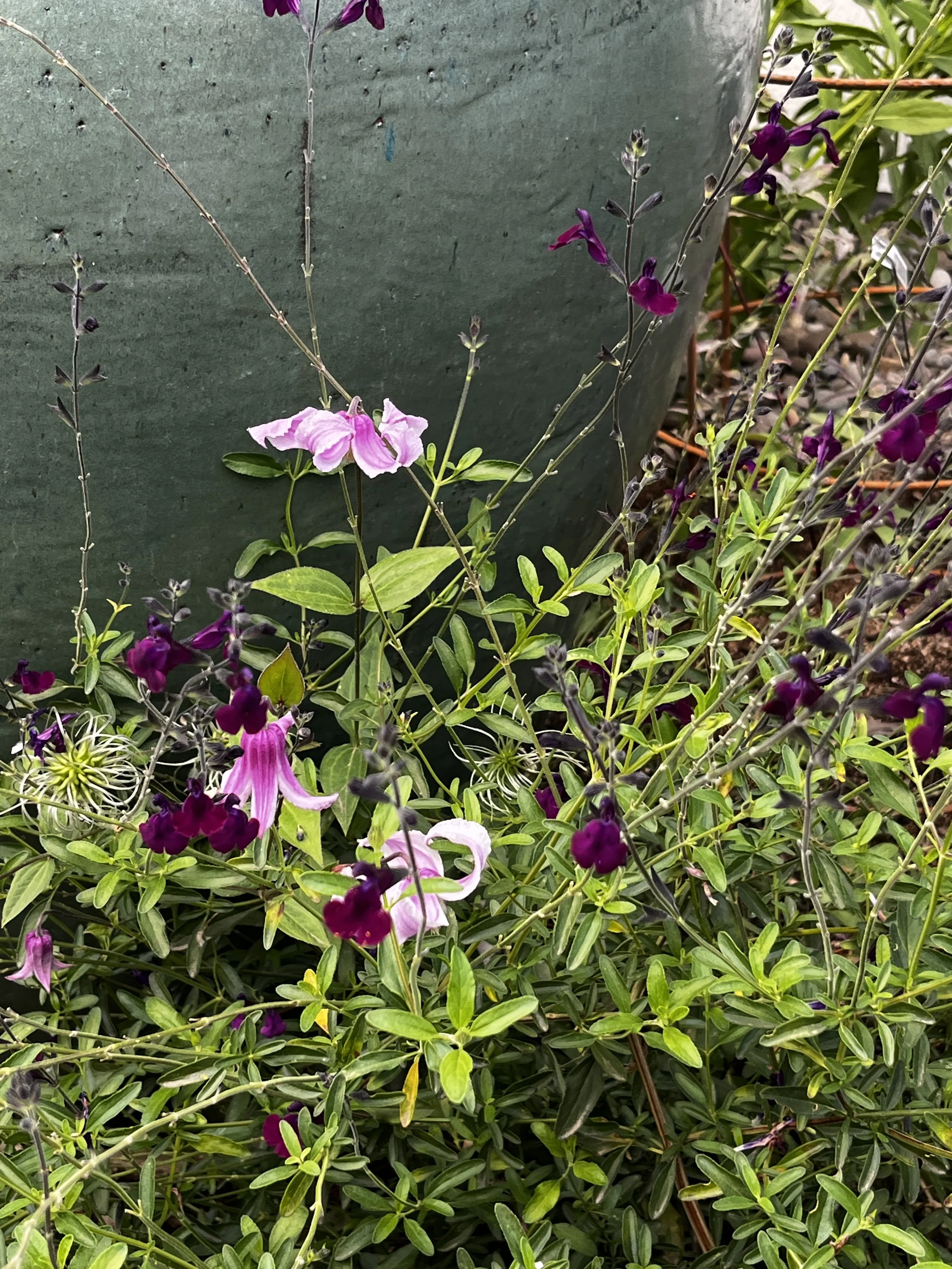 Our non-climbing introduction ‘Twist and Shout’ is sprinkling itself through Salvia ‘Nachtvlinder’ in the Entry Border.