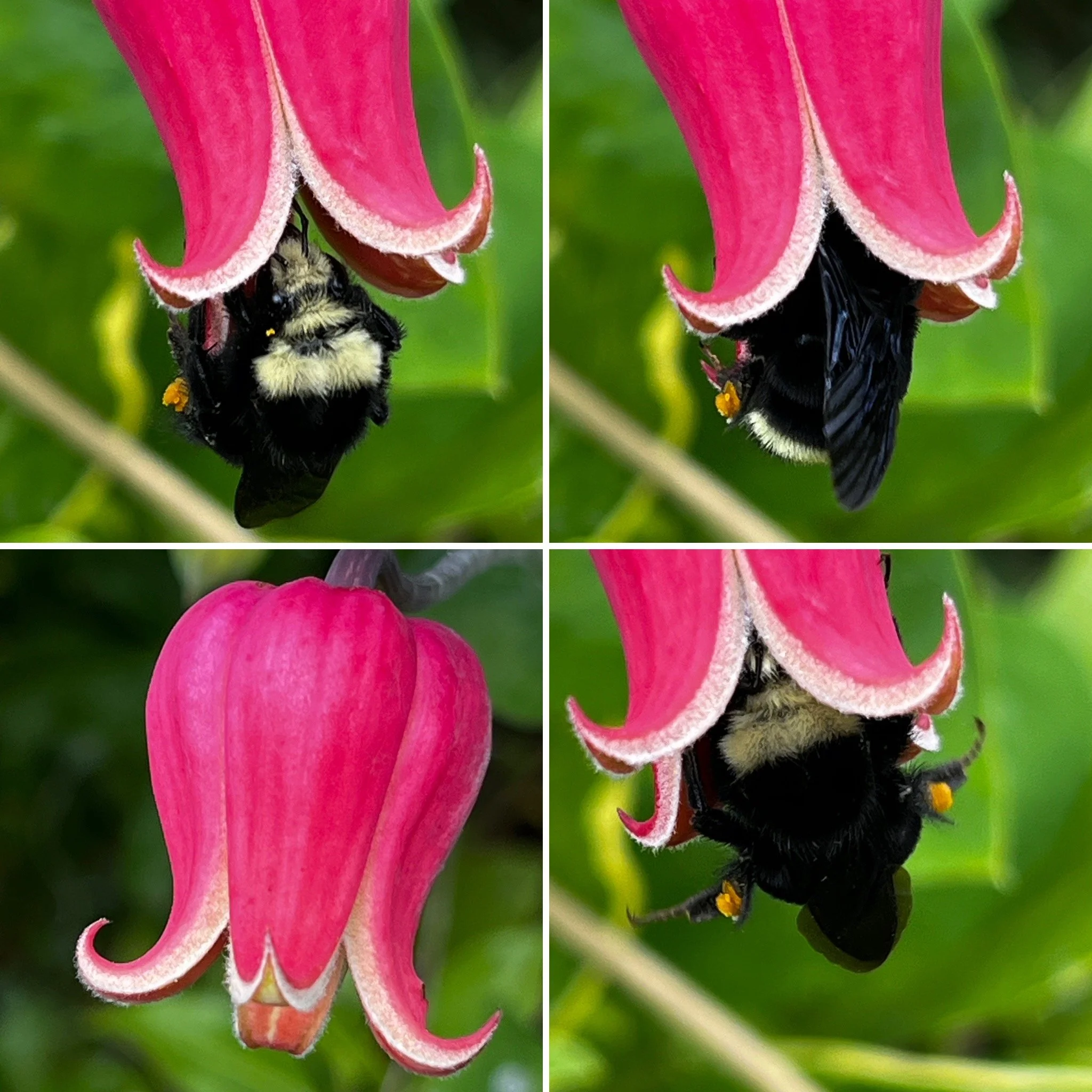 A clip-on macro lens allows us to capture both intimate details of Clematis glaucophylla flowers as well as busy pollinators, like this Yellow-faced Bumblebee. Bed 7