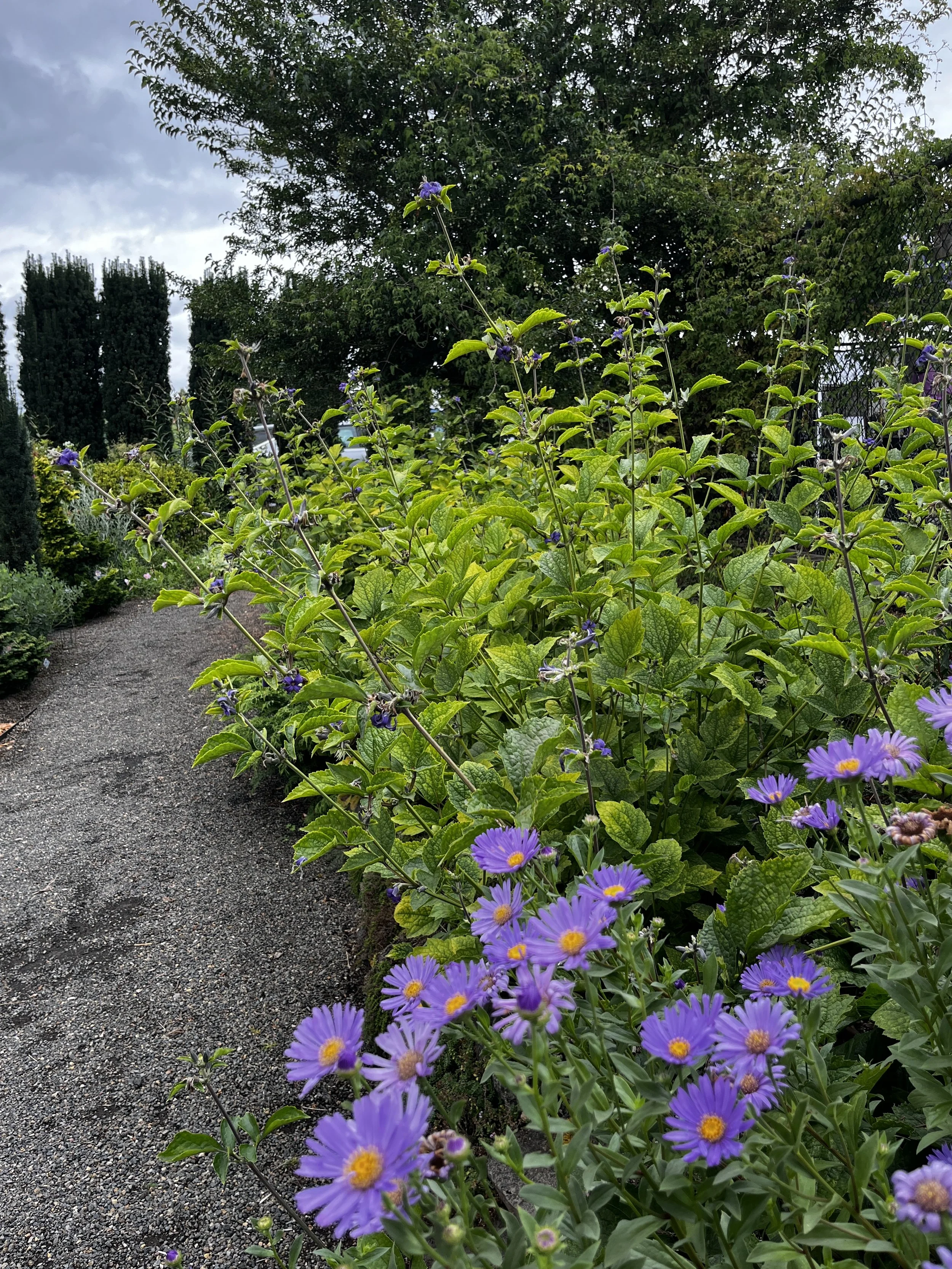Bed 23 is in its full glory, with wands of Clematis tubulosa and heracleifolia hybrids and selections in full and fragrant bloom, interspersed with fluffy mounds of long-blooming Aster x frikartii ‘Jungfrau’. The main clematis here is C. heracleifolia ‘Blue Mood’.