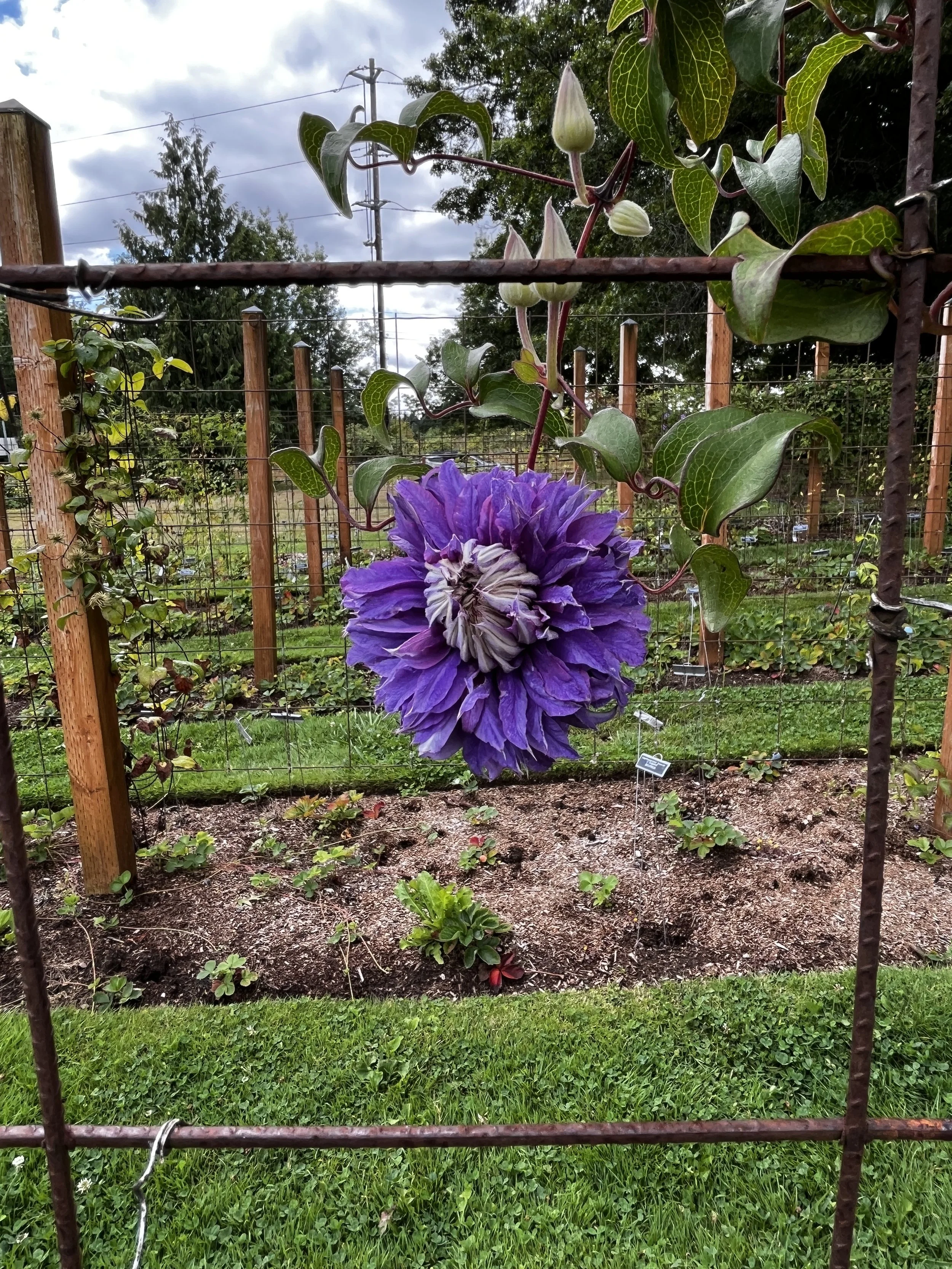 Many of the viticella-type clematis in Row 1 have been cut back to encourage autumn rebloom, but ‘Fairydust’ starts a little later than the others and is still in bloom.