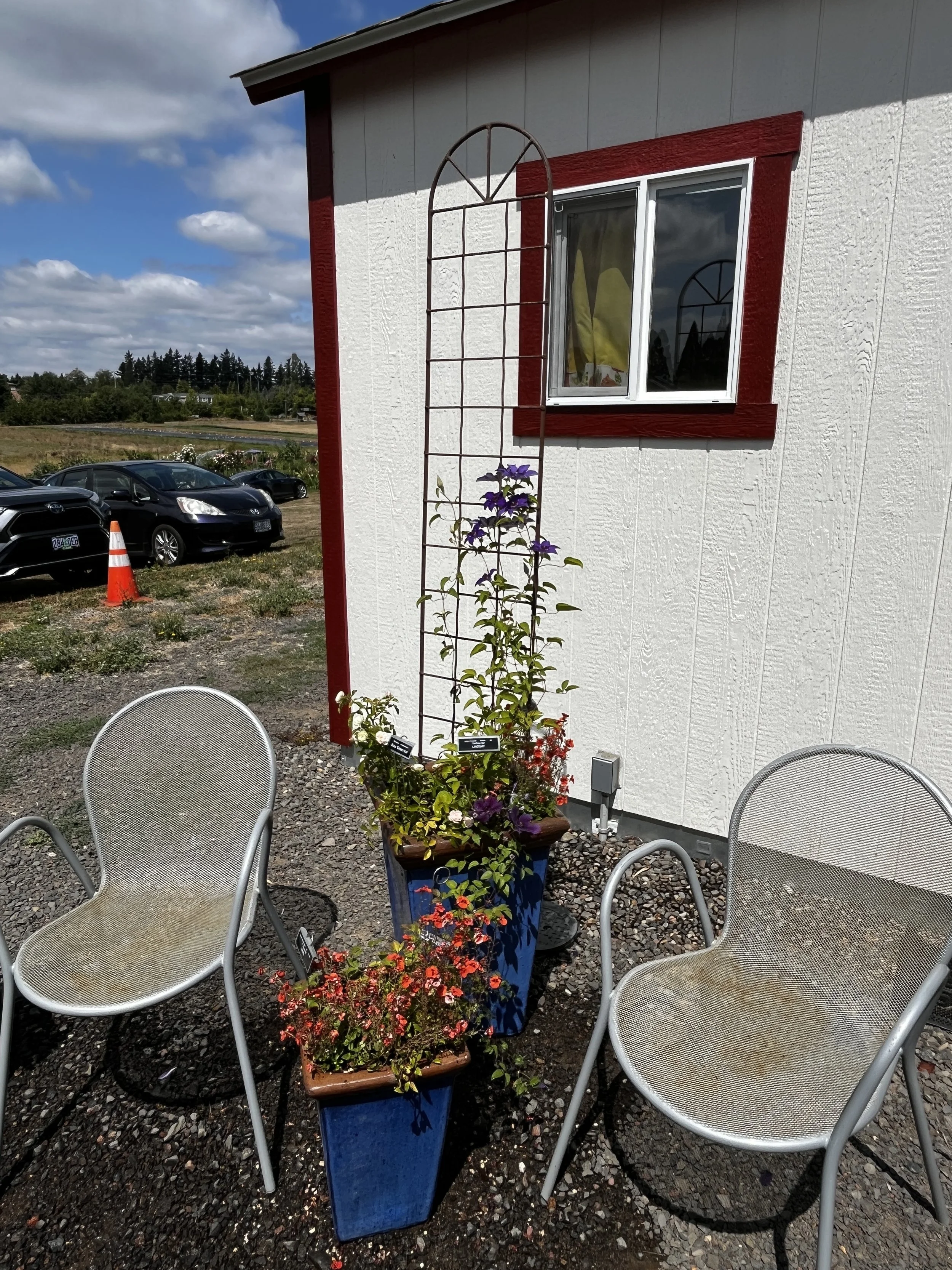 RAVEL (lower purple) and LINDSAY in bloom in our impromptu waiting area.